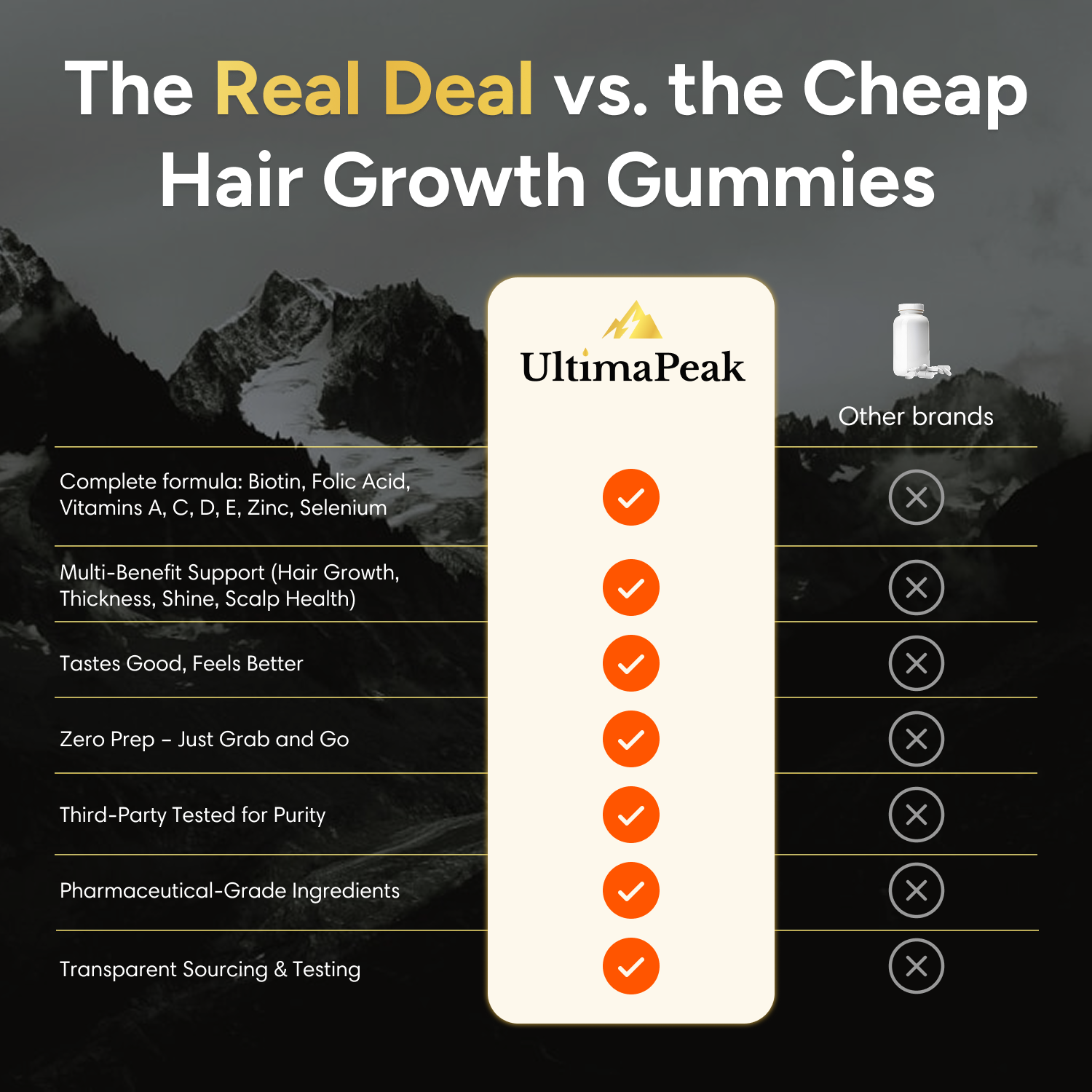 ULTIMAPEAK™ Hair Growth Gummies are designed for ongoing hair growth and thickness support with consistent use and make daily routines easier to keep.